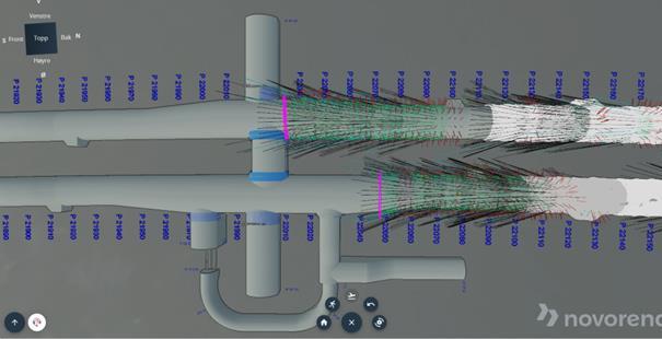 Utklipp 3D-modell; Svarte streker viser der det er borret og sørytet inn injeksjonsmasse for å hindre vanninntregning i tunnelen. Løp 12 øverst. Løp 11 nederstDet var også i februar en god del innlekkasje av vann. Dette må som kjent tettes før man kan sprenge seg videre. Ved stor innlekkasje går dette på bekostning av antall meter man får sprengt seg framover.