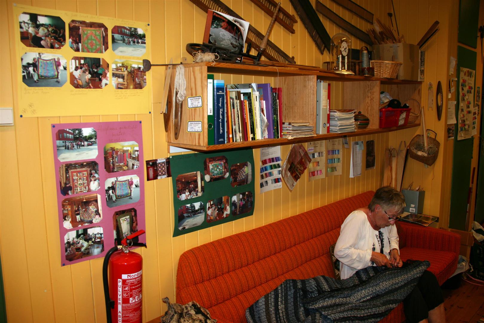 Alle treng heller ikkje veva kvar gong, får eg veta. Dei har ofte anna handarbeid med seg i den orange sofaen, der dei t.d. strikkar, ser i blader og får inspirasjon,