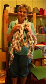 Bjørg Alvestad med ferdig renning.Gamle Kyrkjebygda skule, innvigd i 1951, er ganske stille ein onsdagskveld i 2018. Men det er utanpå, går du opp i tredje etasje blir du møtt av ein gjeng imøtekommande, blide og snakkeglade damer - vevkjerringar, som dei kallar