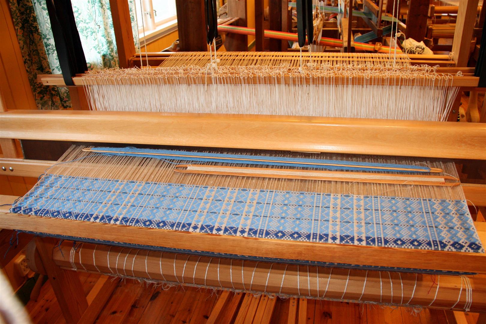 trer, m.m. Det er ikkje berre å setta seg og veva, det er mykje forarbeid. Å slå med vevskeia er berre kos, ler dei.