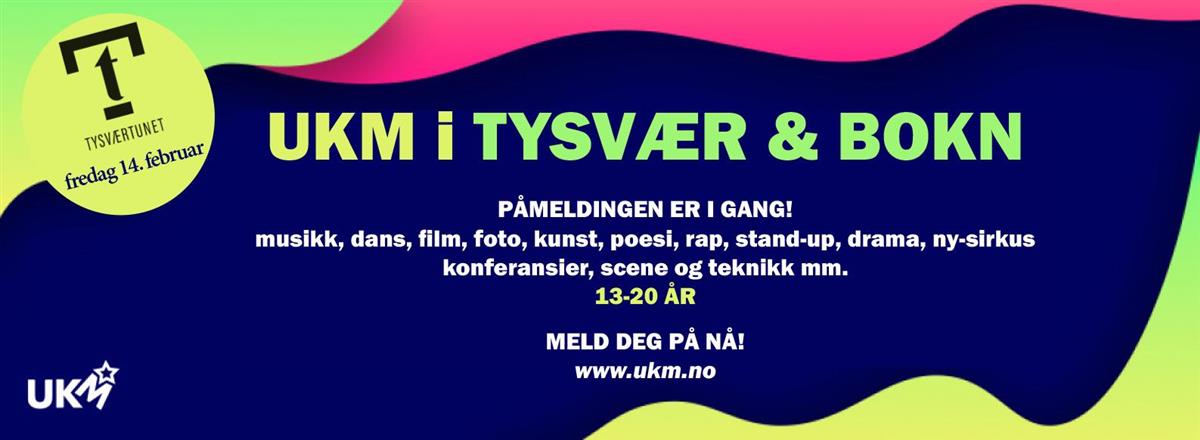 UKM UKM-plakat Tysvær kulturkonror Påmeldinga til årets UKM (Ung Kultur Møtes) i Tysværtunet kulturhus 14. februar har starta. Frist: 10. februar. Påmelding Publisert av Jardar Havikbotn Publisert 06.01.2020 09.53