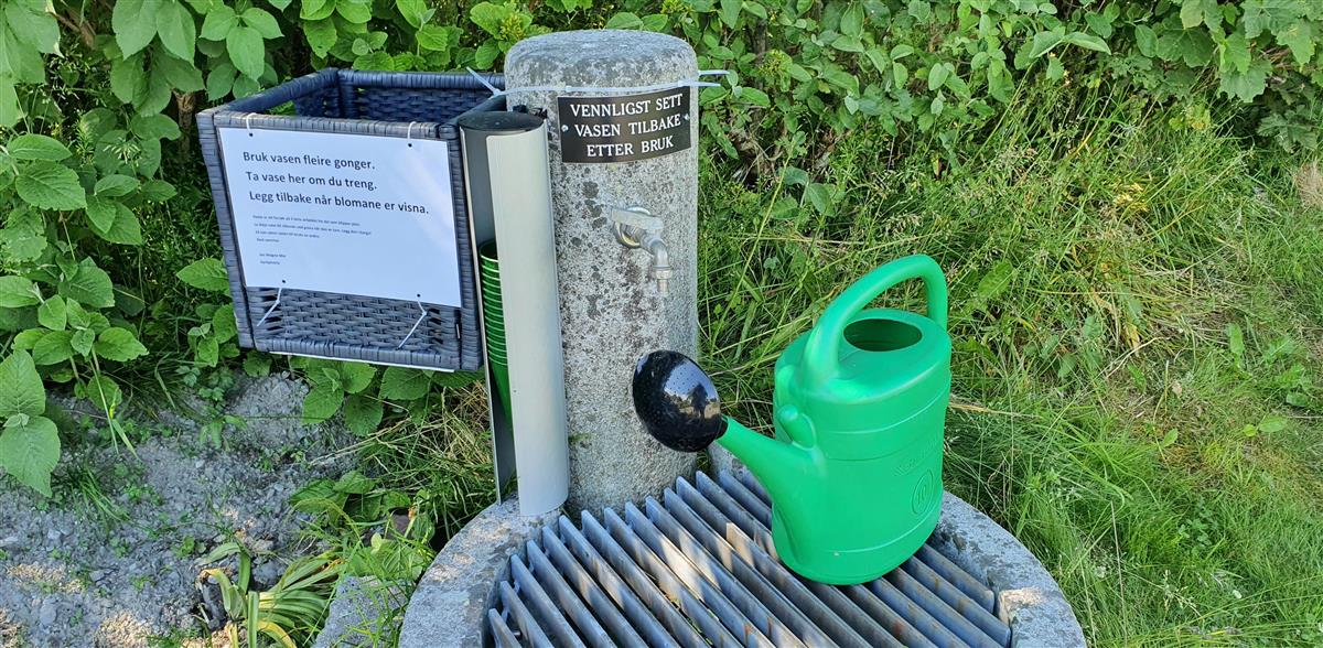 Dersom du har visne blomar på grava og lurer på kva du skal gjere med den tomme vasen. IKKJE set han utfor bedet/bedplata du har ved gravstøtta. Legg han i korga ved vassposten, så kan andre låne til du treng vasen att.