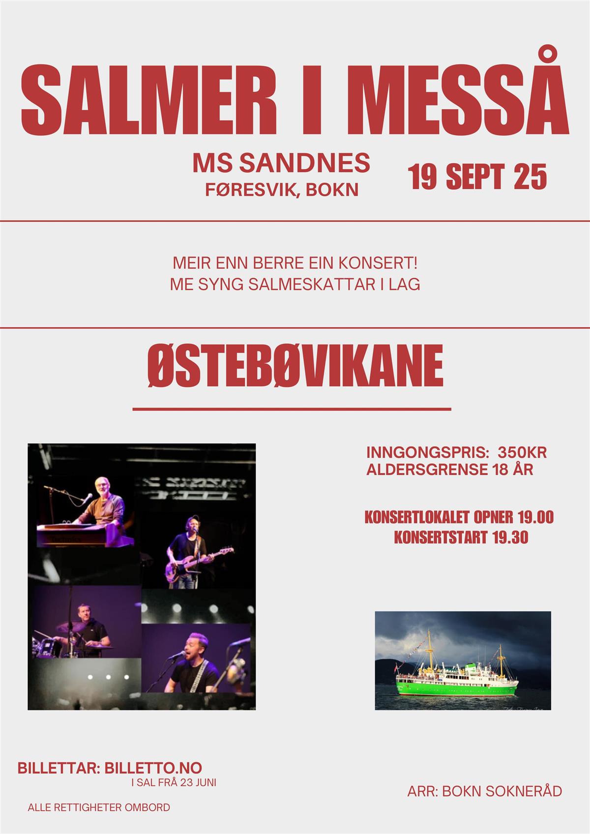 På fredag har Bokn Sokneråd vore så sporty at dei inviterar til «Salmer i Messå» om bord i MS Sandnes. Østebøvikane speler kjende salmar i ny drakt. Her kan ein enten lytta, eller synga med – fart blir det uansett!