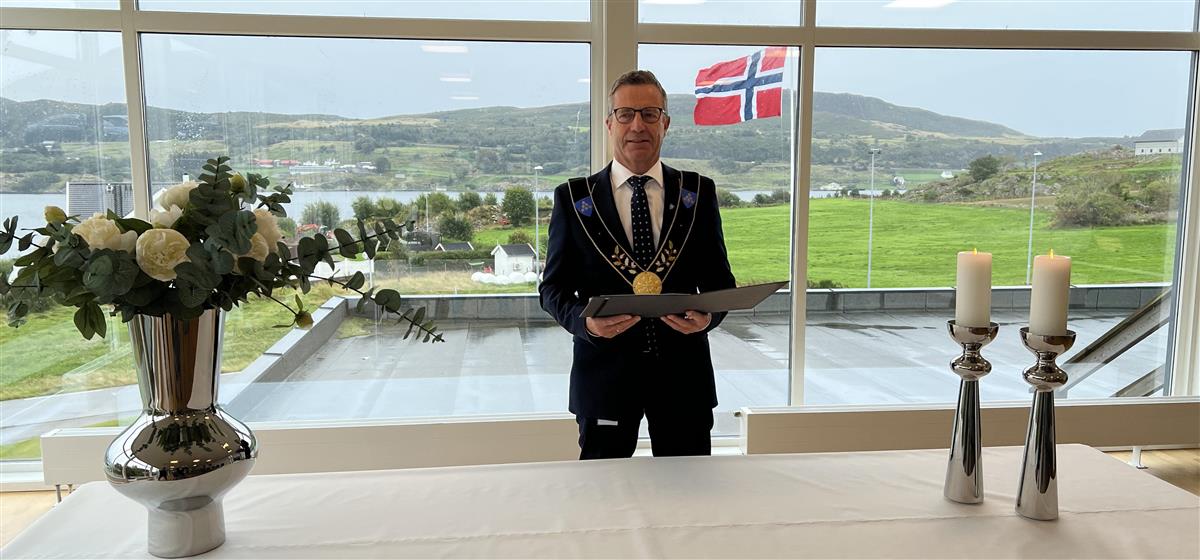 Ordførar Egil Våge klar for vigsel i flott lokale i Bokn Arena.