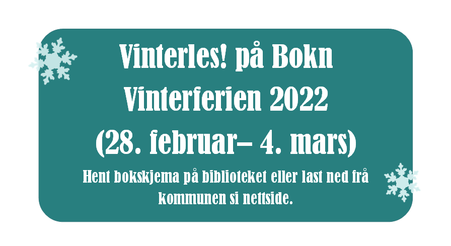 Bokskjema kan hentast på biblioteket eller bli lasta ned her for utskrift heime: Vinterles! 2022 (PDF, 102 kB). Leveringsfrist er 10. mars.