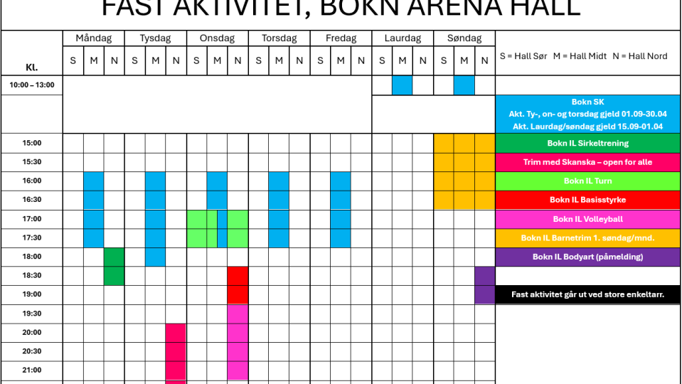 Hallplan etter skuletid Her kan du sjå kva som som går føre seg i Bokn Arena Hall etter skuletid. Publisert 23.08.2024 kl. 14.16
