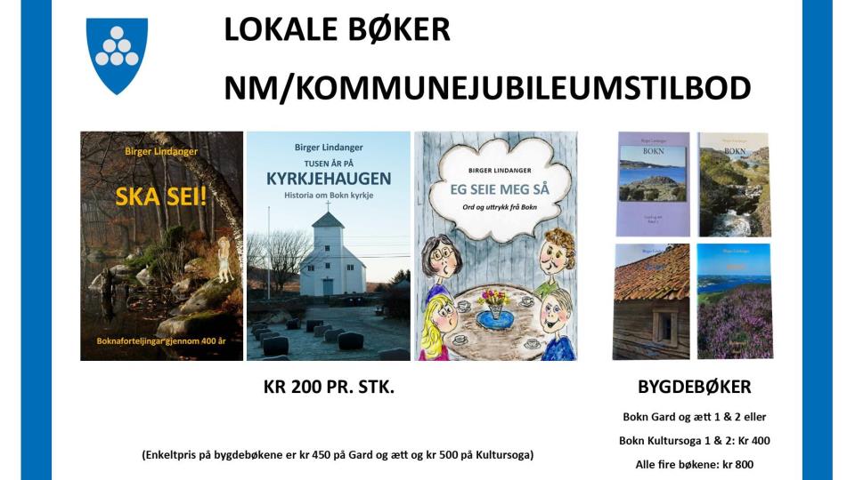 Spesialtilbod på lokale bøker Laurdag 20. sept. har Bokn historielag kafé og utstilling i “Larsen-huset” i Føresvik frå kl. 10, i samband med NM i saueklipping. Då kan du også sikr... Publisert 17.09.2025 kl. 15.25