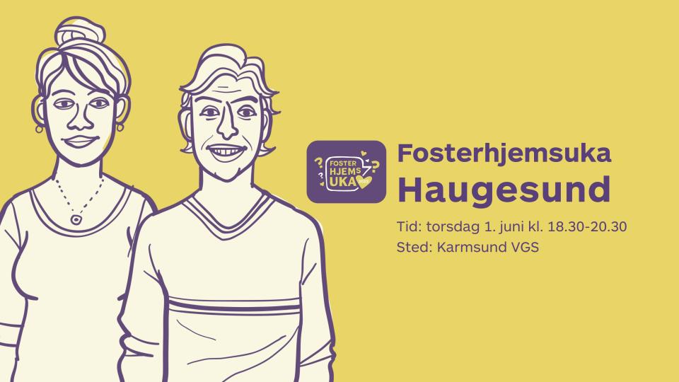 Fosterhjemsuka i Haugesund Fosterhjemstjenesten i Haugesund inviterer til foredrag og en uformell sofaprat om tema UNGDOM, 1. juni kl. 18.30 - 20.30 på Karmsund vgs. Publisert 25.05.2023 kl. 10.01