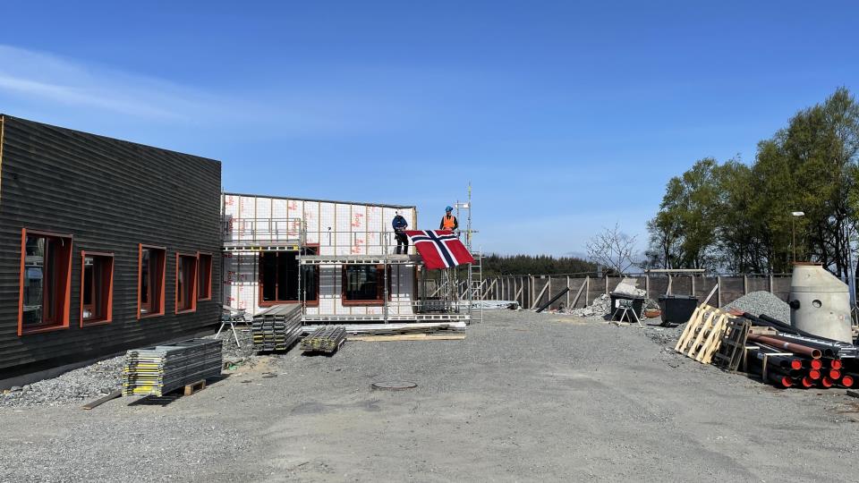 Kranselag 25. april var over 30 stk. samla i kranselag på den nye skulen. Bygget er innflyttingsklart i desember i år. Publisert 26.04.2022 kl. 10.36