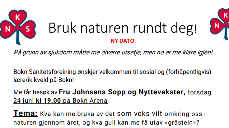 Sosial kveld Bokn sanitetsforening ønsker velkommen til sosial kveld i Bokn Arena, torsdag 24. juni kl. 19.00. Publisert 18.06.2021 kl. 10.16