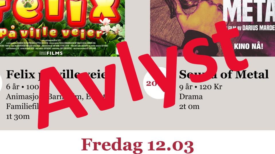 Avlyste kinokveldar På grunn av smittevernforskrifta er kinoførestillingane 12. og 26. mars avlyste. Publisert 11.03.2021 kl. 12.48