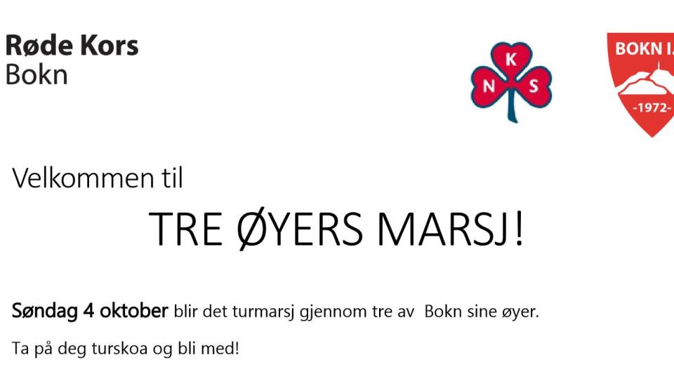 Tre øyers marsj 4. oktober arrangerer Bokn IL, Bokn Røde Kors og Bokn Sanitetsforening ein turmarsj frå Ognahabn til Bokn kyrkje via Håklepp, Vardafjellet og Boknafje... Publisert 17.09.2020 kl. 09.01