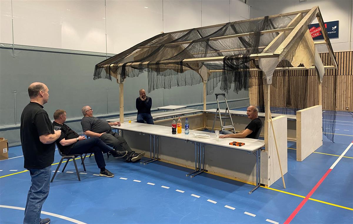 Fv. Rune Vatnaland, Olav Rossebø, Lars Sigmund Alvestad, Tormod Våga og Johannes Nilssen gjer klart i hallen.